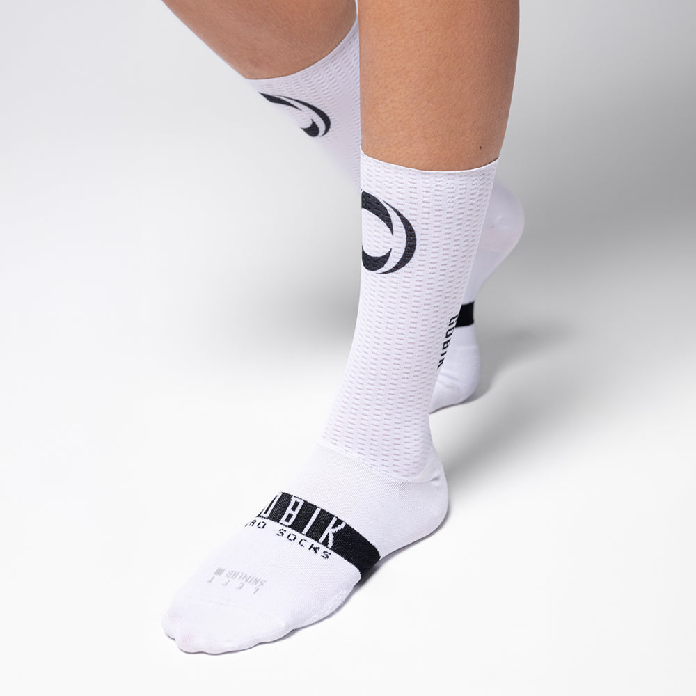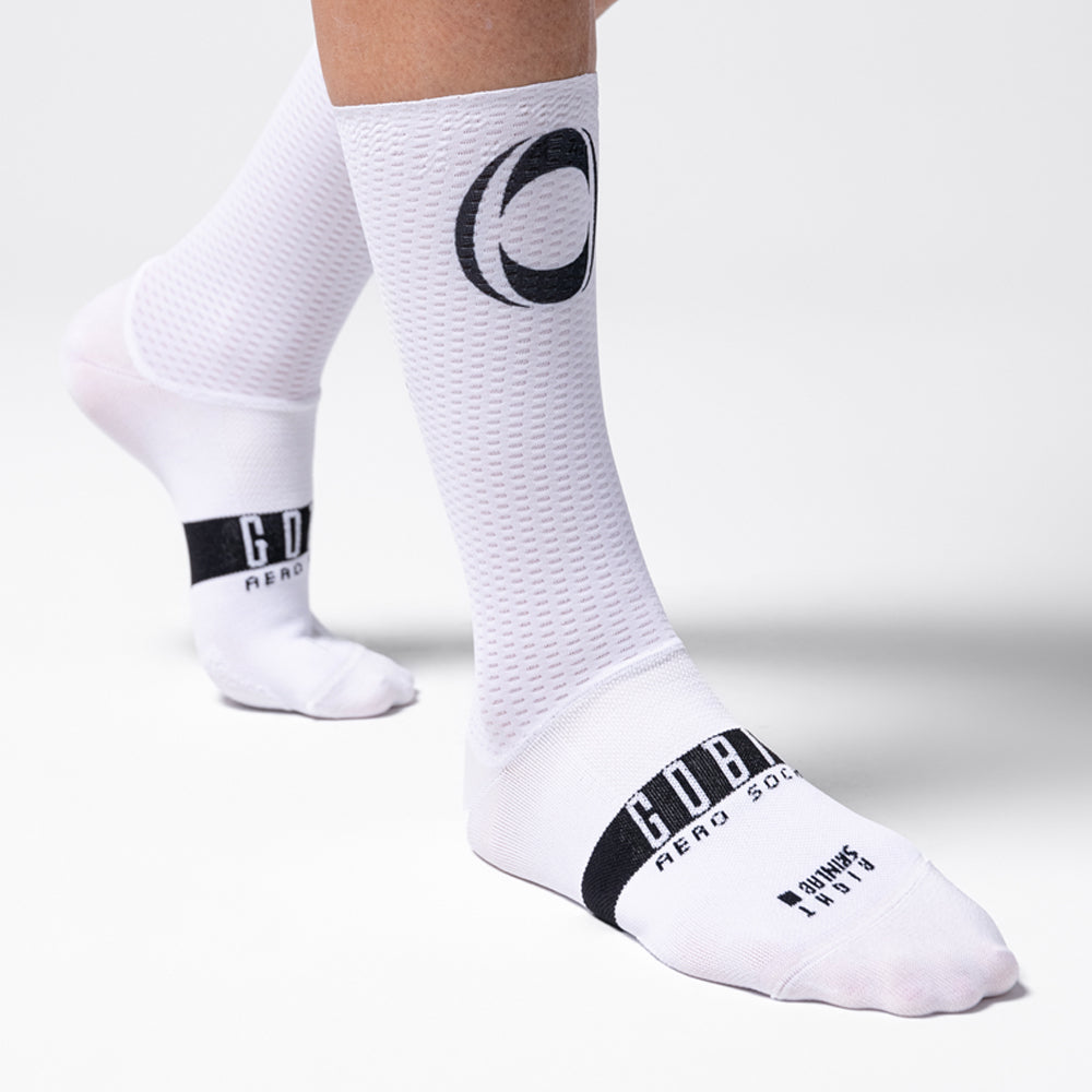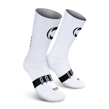 Aerodynamic socks designed for competition and high-intensity training in extreme heat conditions, where every detail matters. Featuring a technical structure tested in wind tunnels by WorldTour teams, they combine a perforated upper section that optimizes ventilation with an extended 22 cm height in compliance with UCI standards.